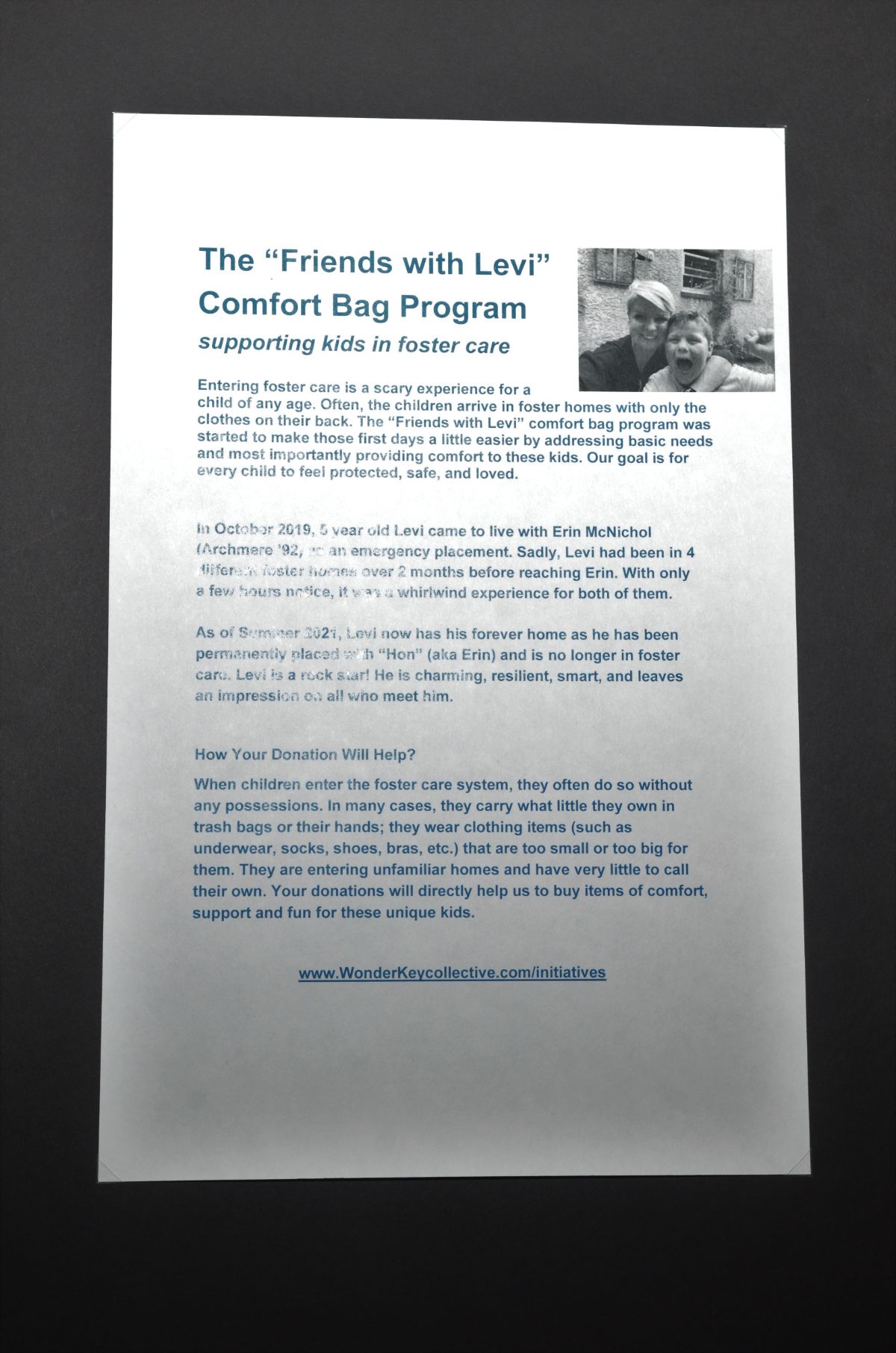 As a result of your generosity, the journey for children in the foster care system will be made a little easier and more comfortable. Our event proceeds will support the “Friends of Levi” Comfort Bag Program – an organization focused on addressing the basic needs of these special children as they enter a new and unfamiliar foster home.